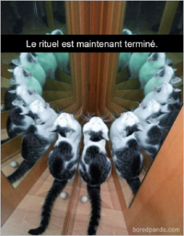 Son corps était tout ce dont il avait besoin. Le rituel ne pouvait s’en passer, je le savais pertinemment. Je l’observai, les yeux mi-clos, les muscles tendus à l’extrême. Je ne pouvais m’empêcher de penser à tous ces gens qui prenaient les chats pour de petites boules pleines d'amour. Le mien, le soir, il invoquait Satan dans mon placard, entre deux miroirs. Il prenait ses croquettes, s'asseyait, restait là , miaulait si je m'éloignais ou faisait du bruit. Enfin, ça c'était d'habitude. Aujourd'hui, il avait rapporté une souris en tant qu'offrande, et m'avait "kidnappé" alors que j'étais en train de faire le ménage. Du coup, je me retrouvais là , une serpillère à la main, un seau rempli d'eau mélangée à du produit nettoyant dont s'échappait une odeur désagréable près des pieds. La vapeur âcre s'élevant dudit seau m’était insupportable. Je relevai la tête juste à temps. J’esquivai la forme sombre qui me fonçait dessus, m’écrasant sans aucune douceur sur le sol. Les odeurs ambiantes me montaient à la tête, embrouillant mes sens. Je n’entendais pas de voix d'outre-tombe me demander mon âme comme casse-croûte, donc ça c'était déjà un bon point. Par contre, un bruit de verre brisé me fit me retourner avec une grimace. Oh non… Eh si. Je n'avais pas suivi ce qu'il s'était passé, mais la boule de poil, dans son quart d'heure de folie, venait de renverser un verre — plein, évidemment — dans sa course folle, avant de déraper sur la nappe, envoyant bouler mon assiette. Un bond qui se voulait majestueux se transforma en gamelle. Se rattrapant in extremis sur le canapé, les griffes en avant, il l'escalada en déchirant le tissu. Sorti de mon hébétude, je voulus me relever en catastrophe, mais glissai, tombai à nouveau, et renversai le seau d'un coup d'épaule involontaire et douloureux. Une flaque s'étendit rapidement sur le parquet avant de rencontrer le tapis, et mon abruti de félin domestique eut la bonne idée de courir dedans. Surpris par la sensation de froid sur ses coussinets, il bondit et… oh non non non, pas le–