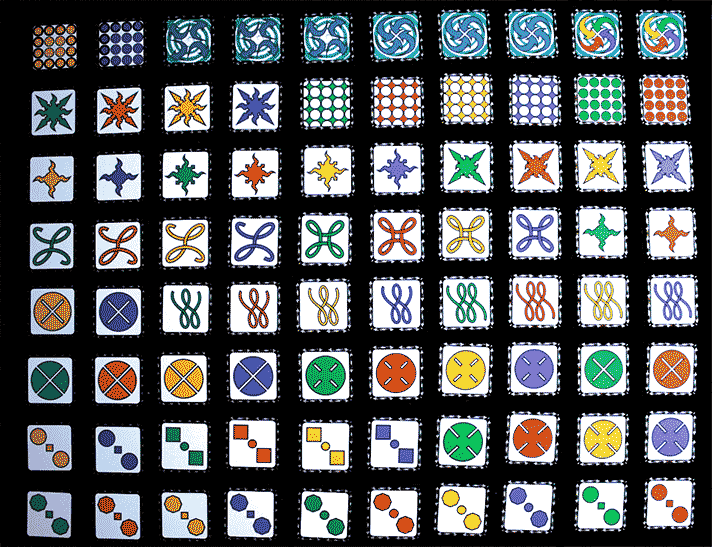 Un petit soleil, peu détaillé, trois boucles bleues, un cercle divisé en quarts verts, deux carré en dialogales et au milieu un rond jaune. Le premier tour est passé le commentateur nomme chacune des cartes et annonce leur couleur, calmement mais toujours avec entrain et attente. Un deuxième tour passe, puis un troisième et soudain : deux quatre boucle tombe.